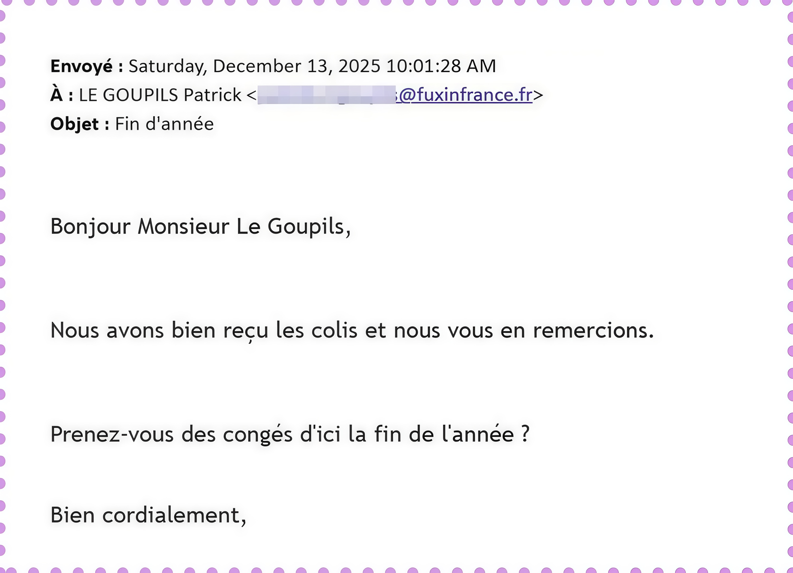 Following the successful delivery, the French client sent a thank-you email accompanied by a box of fine chocolates and a handwritten note. It reads: